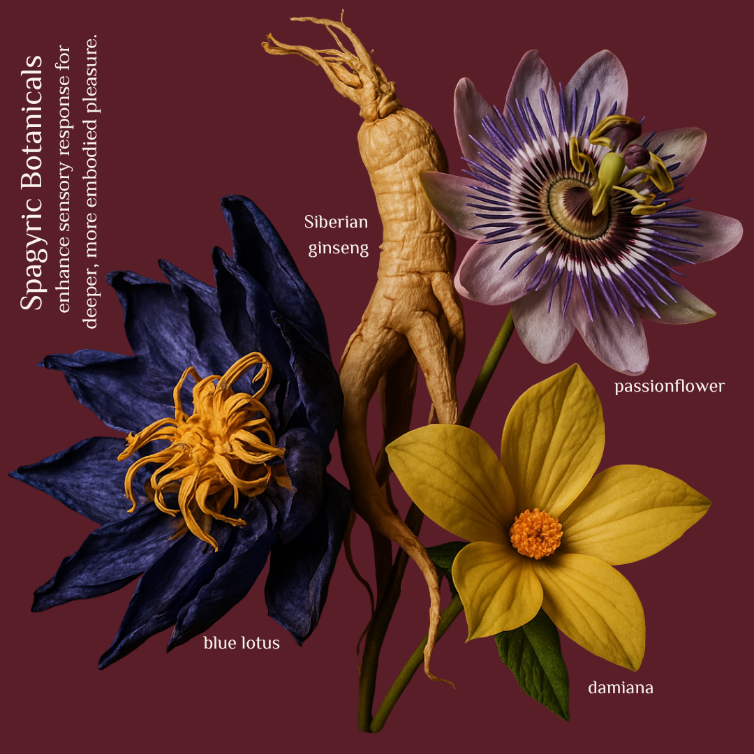 Infused with spagyrics to awaken libido, pleasure, and truth in true intimacy, whether solo or shared. Intimacy, not performance. Coherence, not shame.